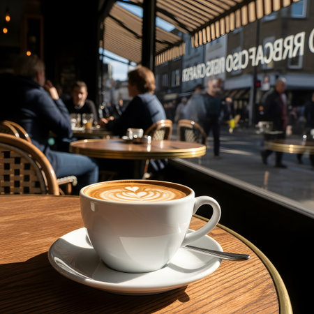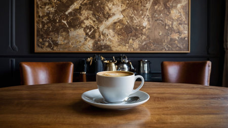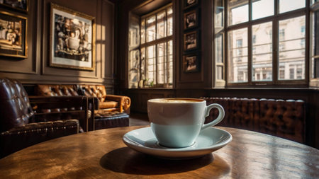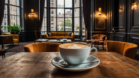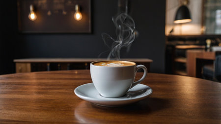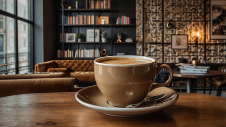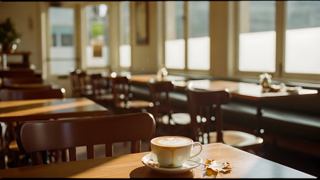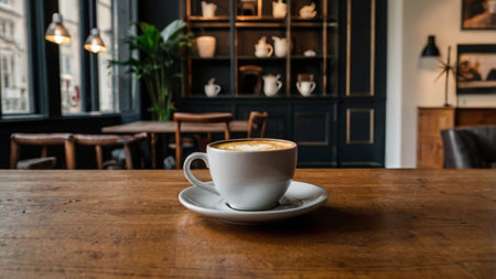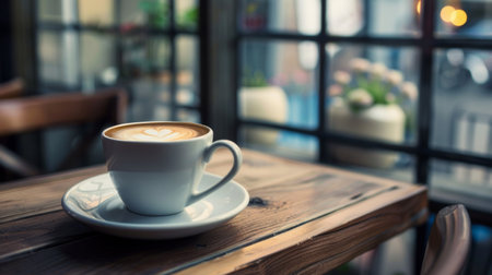 A warm and inviting scene featuring a white cup of latte with heart-shaped art on a wooden table in a sunlit cafe. Perfect for coffee or lifestyle themes.