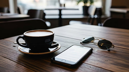 Coffee cup and smart phone on wooden table in coffee shop