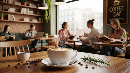 A close-up of a hot coffee cup with steam rising, set on a wooden table in a bustling cafe filled with people enjoying their drinks and conversations.