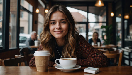 A smiling young woman with long brown hair sits at a table by a window in a cafe, holding a cup of coffee and surrounded by an open book and another cup of coffee.