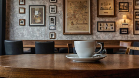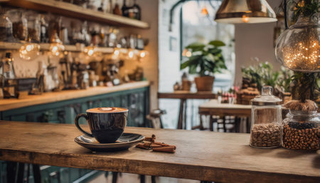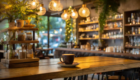 Experience the charm of this delightful coffee shop photograph with its inviting shelf and table setup, embodying rustic elegance, warmth, and a tranquil atmosphere perfect for unwinding.