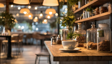This beautifully captured coffee shop photograph highlights a cozy and inviting scene, featuring a perfectly styled shelf and table arrangement, offering a serene environment ideal for unwinding