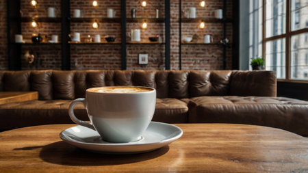 Coffee cup on wooden table and brown leather sofa in cafe