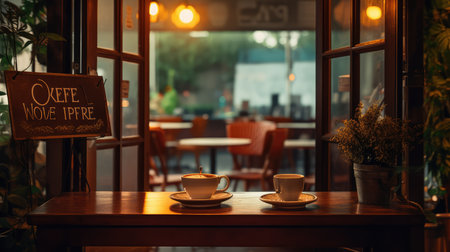 A charming cafe space with an industrial-rustic aesthetic--wooden tables, neutral interiors, and ambient warm lighting.