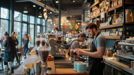 The hustle of a busy coffee shop with patrons enjoying their drinks and baristas crafting coffee, creating a lively community space. Resplendent.