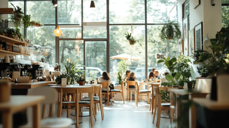 A modern cafe featuring a bright, airy ambiance with brown and white tones, wooden tables for working, and lush natural decor.