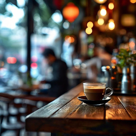 A cup of coffee sits on a wooden table outside a cafe, with people sitting at other tables in the background. The atmosphere is relaxed and inviting, perfect for a casual gathering or meeting.