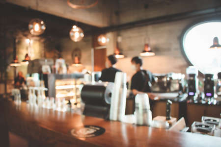 Blur coffee shop or cafe restaurant with abstract bokeh light image background.For montage product display or design key visual layout. Abstract defocused bokeh. orange, red, light. vintage effect.