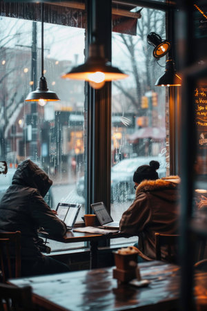 A small, cozy coffee shop on a rainy day, with steamed-up windows and a few patrons reading books or working on laptops. --ar 2:3 Job ID: c5602df0-f2bb-453c-8301-ee7264a36b21