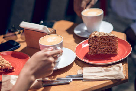 Female and man hands with cups of coffee on the background of a wooden table
