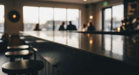 Sleek dark granite bar countertop in a modern cafe with blurred background windows and silhouetted patrons. clean, reflective surface in focus, inviting atmosphere.