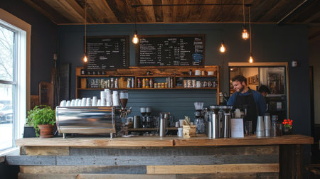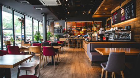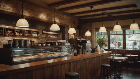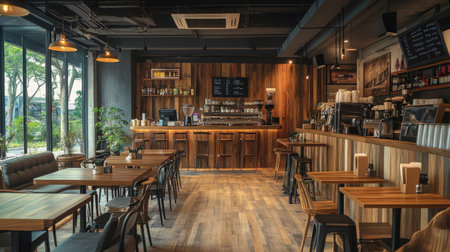 Stylish cafe with wooden interiors, sleek furniture, and a cozy atmosphere. Earthy tones and warm lighting enhance the charm.