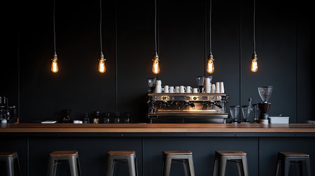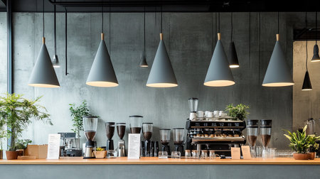 A row of pendant lights hanging over a sleek coffee bar counter in a modern cafe setting.