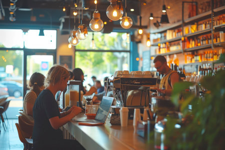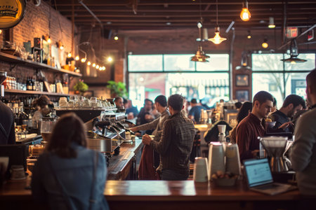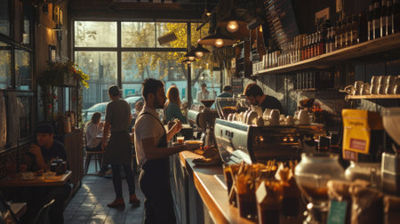 The hustle of a busy coffee shop with patrons enjoying their drinks and baristas crafting coffee, creating a lively community space. Resplendent.