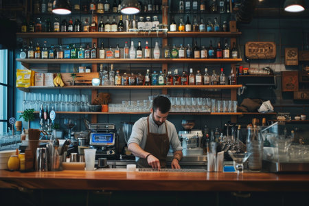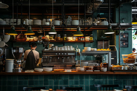 Man Working Behind the Counter of a Restaurant, Impression of an open kitchen cafe with no people present, AI Generated
