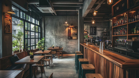 A loft-inspired restaurant interior with concrete walls, wooden flooring, and a sleek bar setup. A perfect blend of modern design