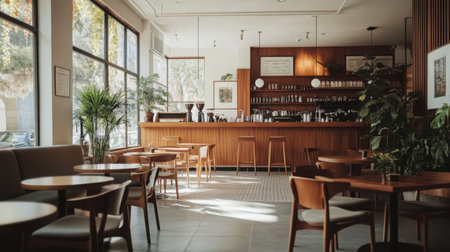 Cozy cafe interior with wooden furniture and natural light during daytime