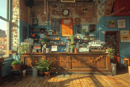 A charming cafe interior featuring warm pendant lighting, lush plants, and a wooden counter. The modern design creates an inviting ambiance for relaxation.