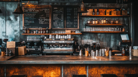 Discover a charming cafe interior with a wooden bar counter, stylish decor, warm lighting, and inviting atmosphere ideal for enjoying drinks and relaxing with friends.