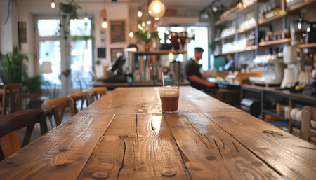closeup to empty wooden table with chairs and blurred background with cafe area and barista serving organic drinks