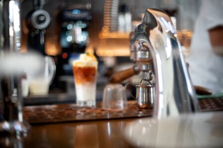 Blur image Coffee maker head in the coffee shop with cup in blur background image.