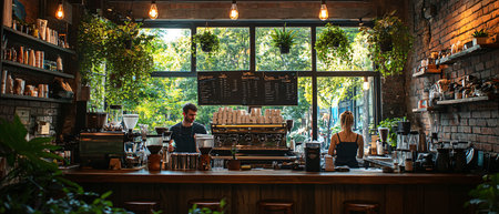 A warm and inviting coffee shop interior featuring a sleek espresso machine, rustic brick walls, wooden shelves, and lush greenery for a cozy atmosphere.