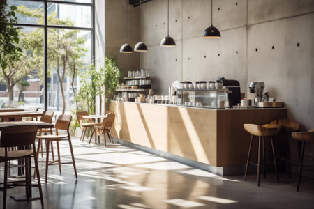 Interior of modern coffee shop with raw concrete wall, cement floor, bar counter with stools. By generative Ai
