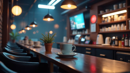 Coffee Cup on a Bar Counter in a Trendy Cafe, generative Ai