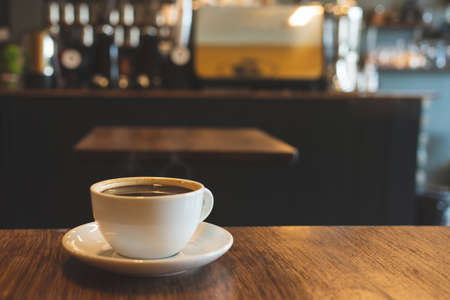 Soft focus blur Hot coffee cup of black,coffee on wooden table in the morning.