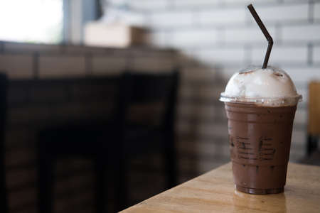 Glass of iced mocha with cream on top at coffee shop