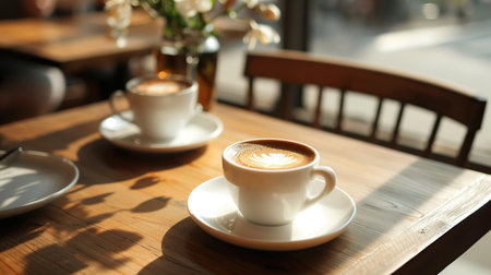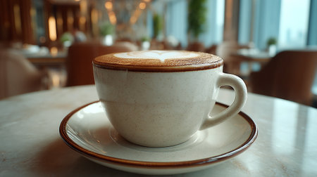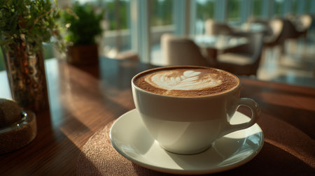 Elegant coffee cup with creamy latte art near a bright window