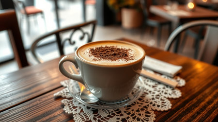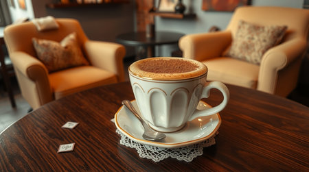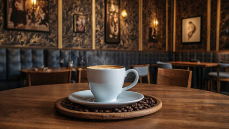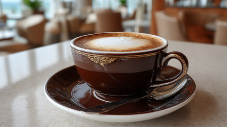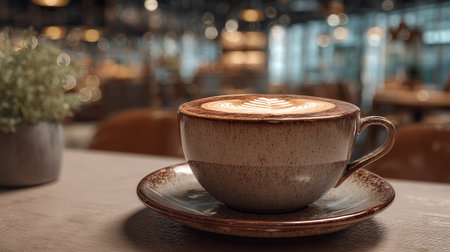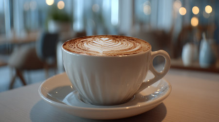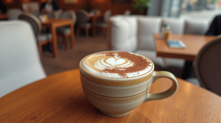 Coffee Cup with Latte Art in Cafe Setting, Enjoying Relaxing Moment
