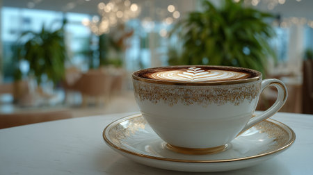 Exquisite latte art presented in an upscale cafe setting.