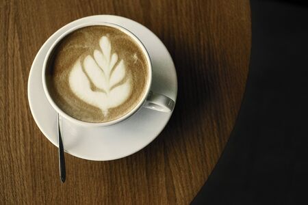 A cup of latte on a wooden table in a cafe on a cold working morning