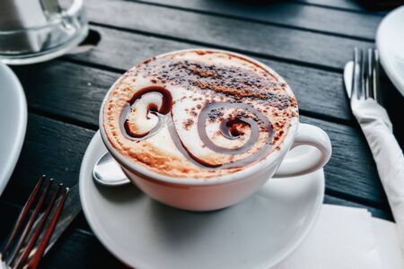 Cappuccino coffee in a white cup on a wooden table