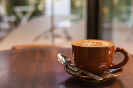 Coffee cup on wooden table in coffee shop, stock photo