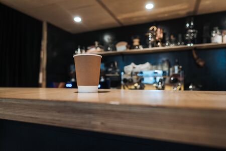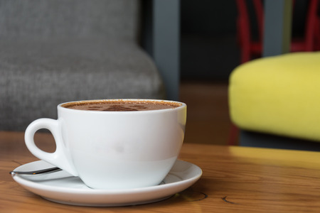 Coffee cup on wooden table in cafe. Blurred background.