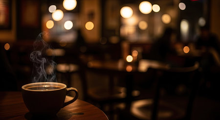 Coffee cup on wooden table in cafe with bokeh background