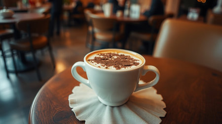 Cup of cappuccino with chocolate on table in cafe