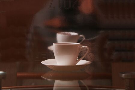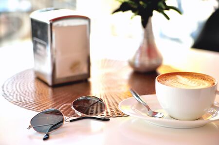 cup of coffee and glasses on a table in a cafe morning sunlight blur close-up