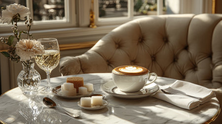 delicate cappuccino rests in artisanal cup, accompanied sugar cubes and stylish spoon on white marble counter inviting atmosphere enhances experience
