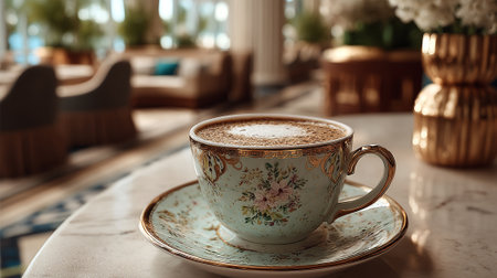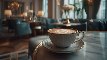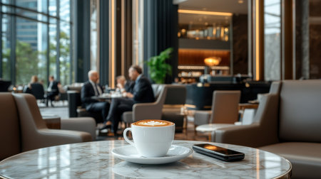 Elegant Cappuccino on Marble Table in a Luxurious Hotel Lobby Setting