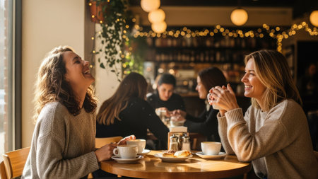 Two women are seated at a round table, enjoying coffee and conversation in a warmly lit cafe. The scene features natural light, casting soft shadows on the subjects. The composition suggests a relaxed social gathering, suitable for various editorial and commercial applications. The cafe has soft warm lighting and other people in the background.