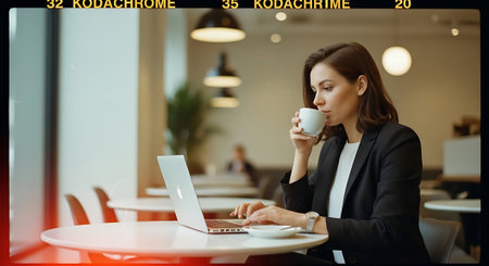 A businesswoman working on her laptop while enjoying a cup of coffee