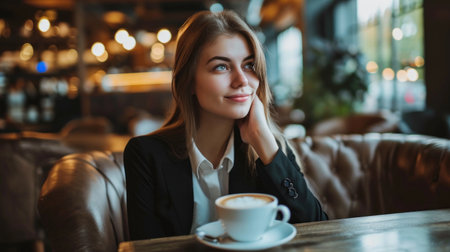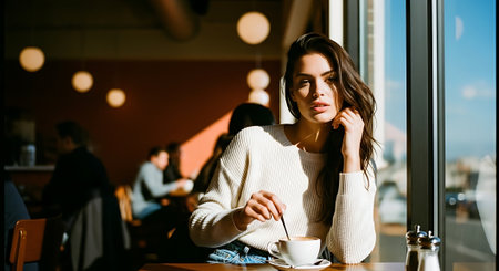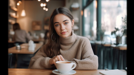 A young woman enjoying a cup of coffee in a cozy cafe