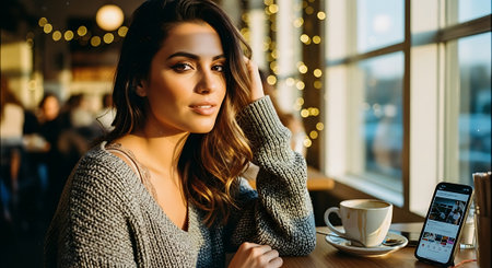 A young woman sitting in a cozy cafe with a cup of coffee and her phone