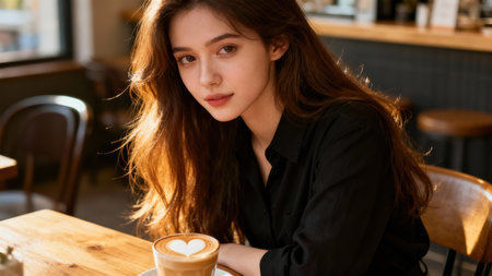 Warm natural light portrait of a serious young woman with highlighted dark brown hair sitting by a window, focused on her face and a latte cup with foam heart design.