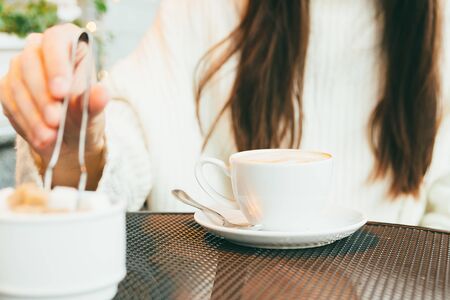 The hand of a young girl who takes refined sugar to put in a cup of coffee. Middle plan, focus on a cup of coffee.