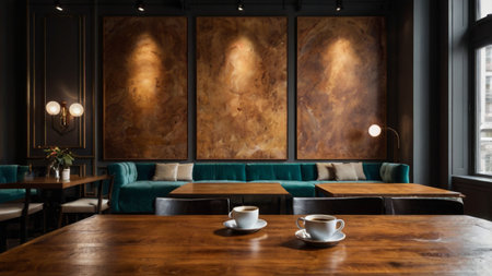 Interior of a luxury restaurant with green sofa and two coffee cups