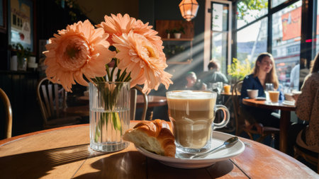 A glass of a cup with flowers and croissant on table, AI